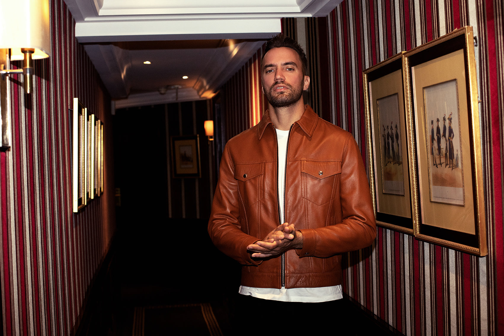 Le blouson présenté a été réalisé en cerf cognac, personnalisable dans le cuir et coloris de votre choix.
